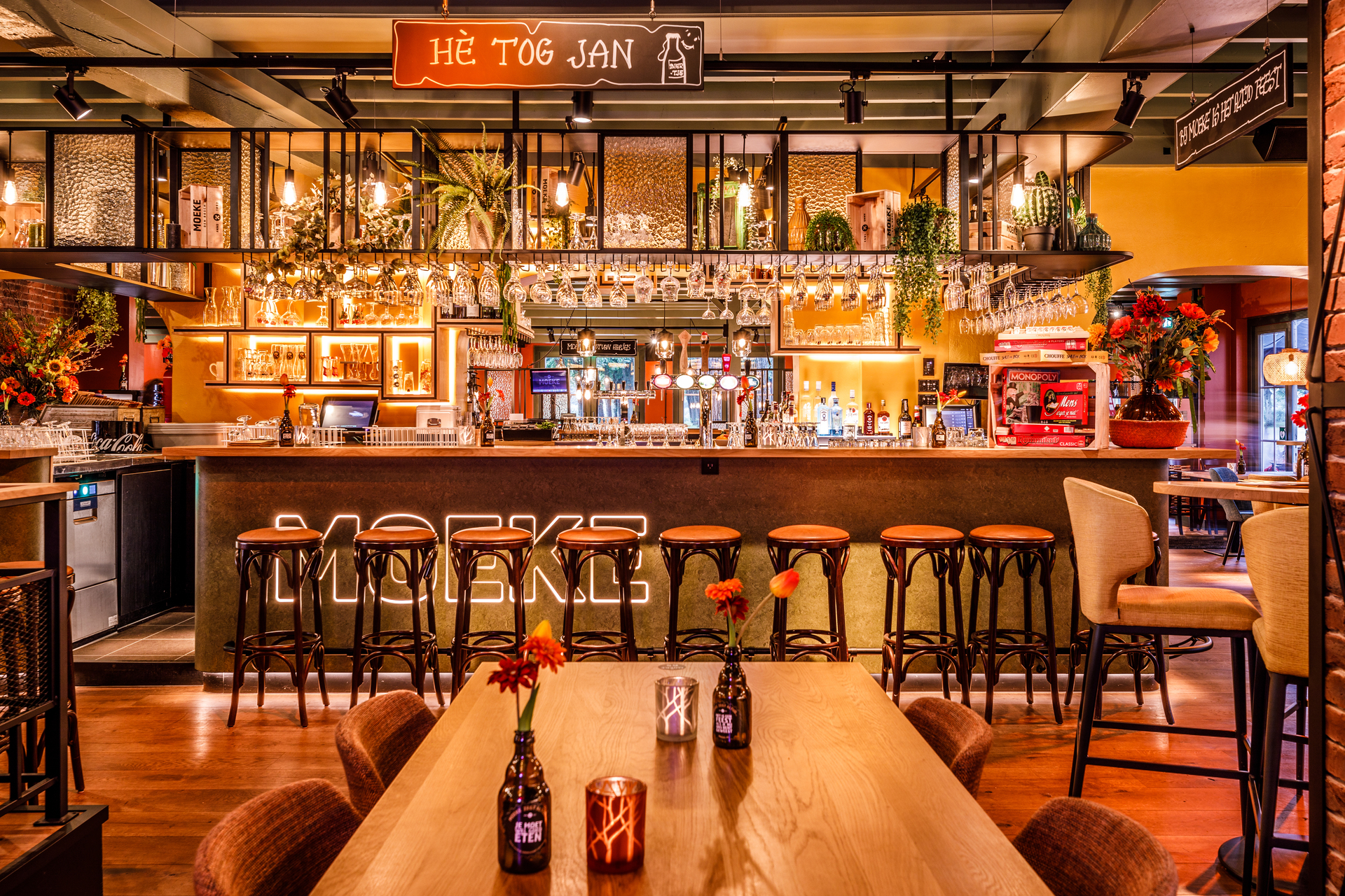 Iedereen komt graag bij Moeke over de vloer. Voor een kop koffie, een broodje of om ’s avonds lekker aan te schuiven voor het eten. Moeke zorgt voor de hapjes en de drankjes. En natuurlijk een gezellige sfeer. ‘Ik zit even bij Moeke’ is dan ook het mooiste excuus om het wat later te maken. Om net iets langer te genieten, te tafelen of nog een laatste drankje te bestellen.