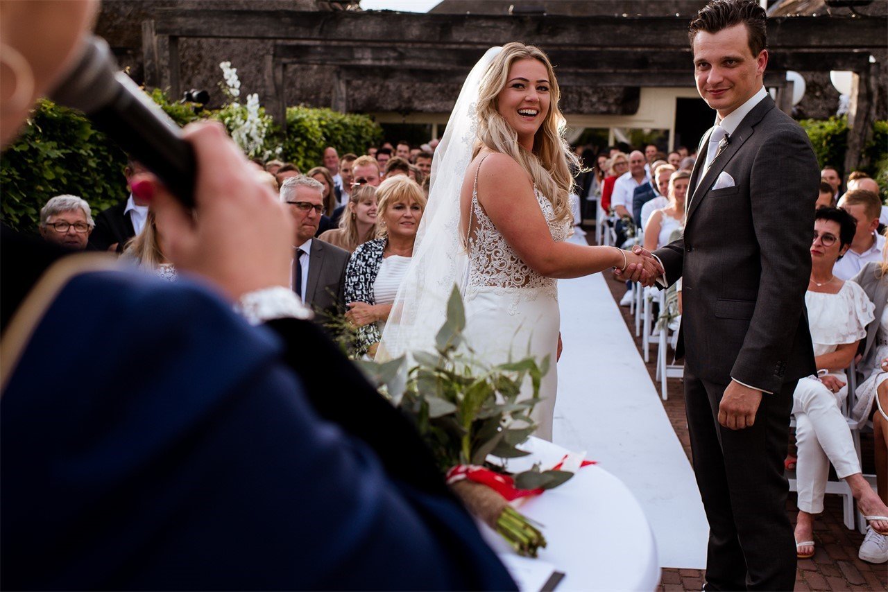 Jullie trouwdag begint met een warm welkom. Voorafgaand aan de ceremonie ontvangen wij jullie en alle genodigden met koffie en thee. Vervolgens voltrekt de trouwambtenaar het burgerlijk huwelijk op locatie bij Moeke – een sfeervolle setting waarin jullie elkaar officieel het ja-woord geven.